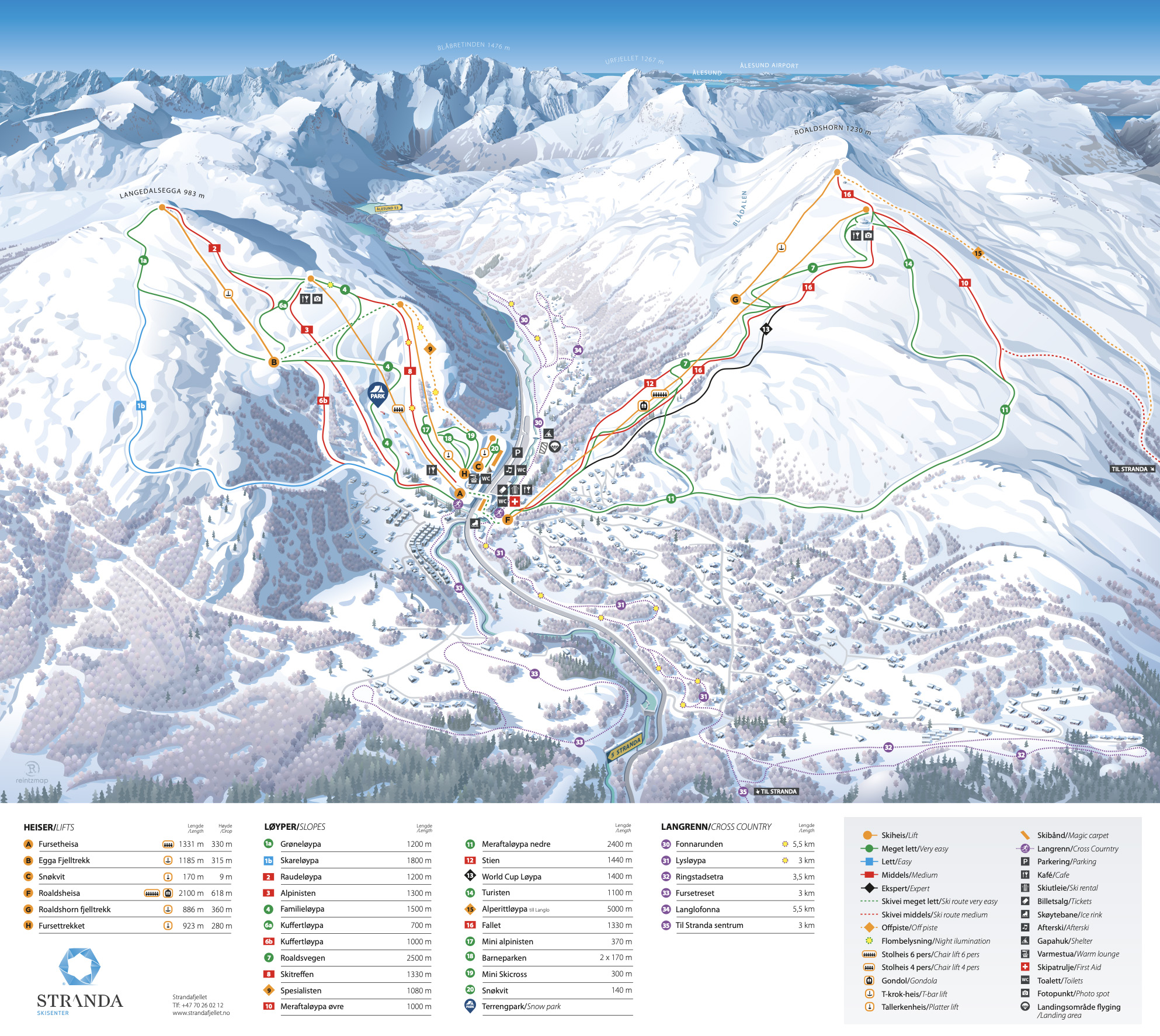 Det finns begränsat med bäddar i området vilket gör att liftköerna uteblir och att snön länge ligger orörd. Liftsystemet är uppdelat i två områden. Langdalsegga och Roaldshorn erbjuder 800 fallhöjdsmeter av kalfjäll och skog vilket gör åkningen riktigt intressant och mycket varierande oavsett solsken eller snöfall. För puderfrälsta är en tur ned i ”Blådalen” ett måste när man är i Stranda, det är ett åk i alpklass med röd-svart lutning på 800 fallhöjdsmeter.