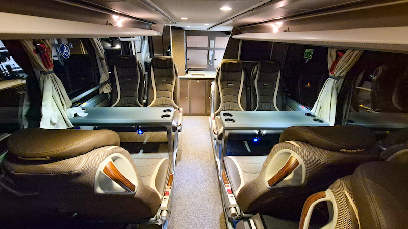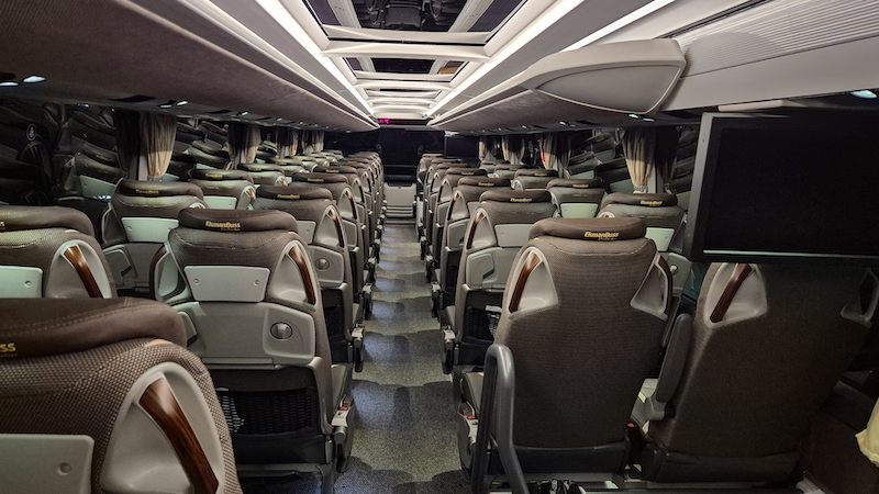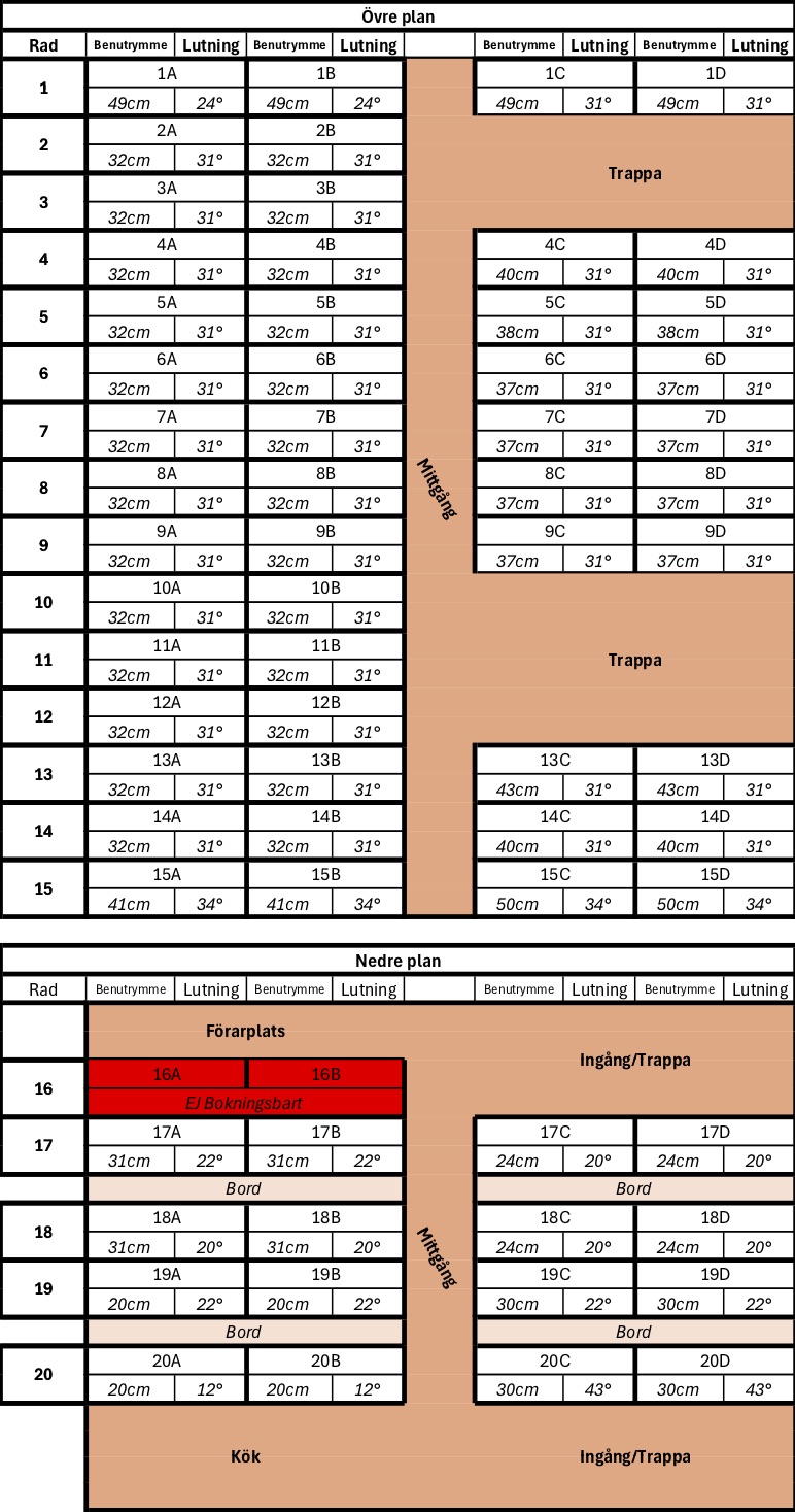 Vår nya buss är en av de abslout bekvämaste långfärdsbussarna på marknaden med färre platser till förmån för extra komfort. Mycket har att göra med vilken plats du väljer. Har du svårt att sova på buss eller flygplan råder vi dig att satsa på att boka en plats där sätet har stor lutning och extra benutrymme. Vår buss har platser med upp till 31 graders lutning, vilket är exceptionellt.