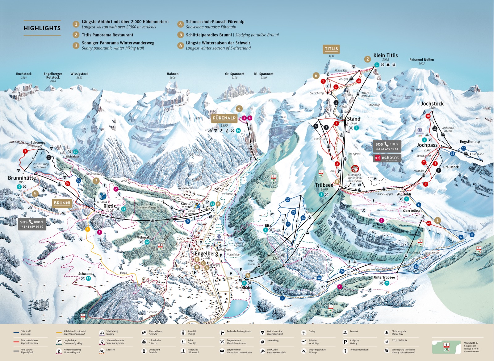 Offpist-skidåkningen är mycket lättillgänglig. Man når åk som Steinberg, Laub och Galtiberg direkt från liften. När lössnön börjar bli uppkörd kan det var värt att hika någon timme upp till Wendelycke eller till toppen av Titlis.